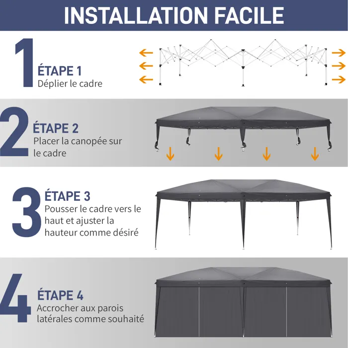 Installation Rapide (Pop Up) Le mécanisme pliant permet un déploiement aisé de la structure. Les tubes en acier assurent la tenue de l’ensemble une fois déplié.
